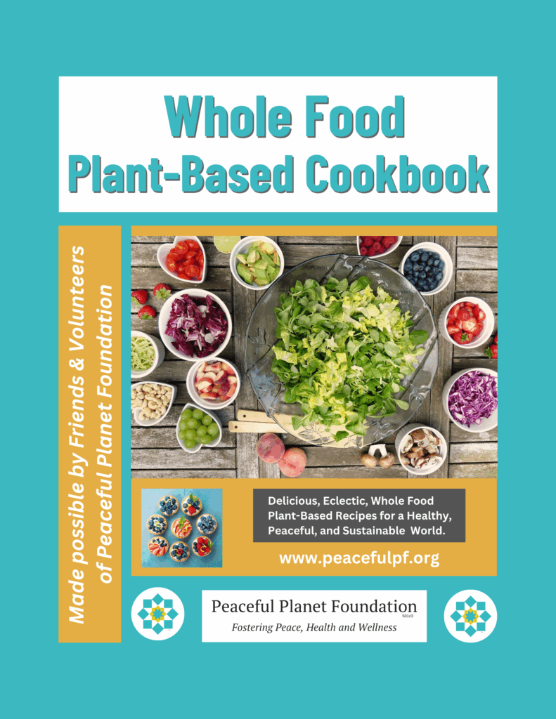 Over 55 Whole Food Plant Based Recipes in a color, wire-bound book. These recipes are made possible by the volunteers of Peaceful Planet and the greater Houston area plant-based community. With the purchase of the hard copy, you also have digital access and this will allow you continued access as more recipes are added. See sneak-peek below.